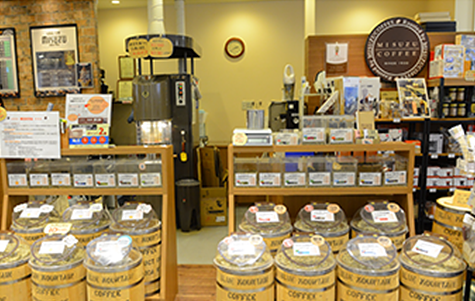 CAFÉ工房MISUZU 新さっぽろカテプリ店は、JR新札幌駅に直結するショッピングモール、カテプリの地下1階にある、焙煎販売を兼ねた店舗です。エスカレーターに乗り、地下1階に着く前から、すでにコーヒー豆の良い香り、、、そして、目の前に、サイフォンと、生豆の樽、そして焙煎機が並ぶオープンカフェ風な「珈琲工房」が現れると、そこに、珈琲好きにはたまらない世界が広がります。笑顔で迎えてくれたのは、珈琲インストラクターの資格を持つ店長の三ツ石咲子さん。