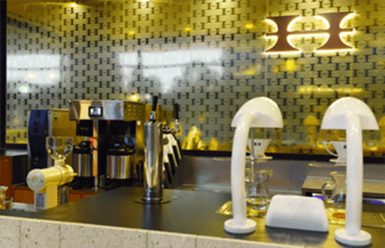 セラフィムの独特のフォルムは、美しい店舗デザインと一体化し、圧倒的な存在感を放っています。大きく高い窓に囲まれた、上質なエントランス空間を遮ることなく高級感を醸し出す店舗のしつらえの一部としての品のある存在感。この店舗は、堀口珈琲横浜ロースタリーの設計もしている気鋭の建築家、高塚章夫氏によるもので「堀口珈琲が本物志向であるように、店舗のデザインも、他のコーヒー店との違いを一目見てわかるような作りにしたい。」というコンセプトでつくられました。カウンター前面には、表情が豊かで、コーヒーの生豆の雰囲気に似ている「大谷石」を、壁面には、黄金の輝きを柔らかく放つ「真鍮の壁」を。上質な素材を限定して用いることで、素材が元来持つ豊かな表情や品格を引き出したデザインを演出しています。