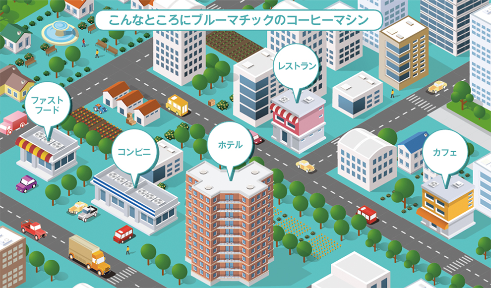私たちブルーマチックジャパンは、業務用コーヒーマシンの専門商社です。 アメリカやイタリア、スイスといったコーヒー先進国の世界的メーカーから、高品質なコーヒーマシンを輸入しています。私たちが手掛けたコーヒーマシンが設置されているのは、皆さんも一度は足を運んだことのあるカフェチェーンやファストフードチェーン、レストランチェーン、コンビニエンスストアなど。皆さんの「気軽に美味しいコーヒーが飲める暮らし」のすぐそばに、ブルーマチックジャパンがあります。